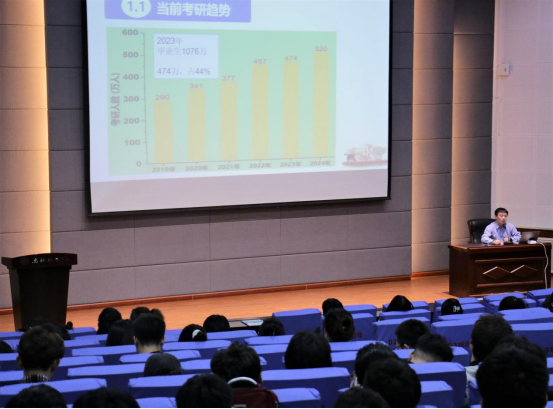 王康军院长报告结束,余海军书记从近年的考研人数和学院近几年考研率变化情况为同学们分析了当前考研形势,他指出如今考研的人数在不断增加,考研面临的挑战也越来越多。他希望同学们能够不惧挑战认清自我需求,提升自我竞争力,实现自己的考研目标。